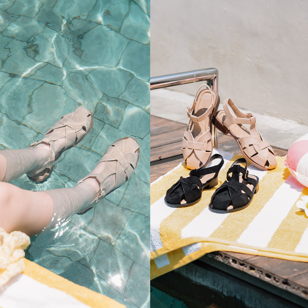Our summer collection combines coastal textures and floral inspirations, merging delicate design with the comfort every traveller craves. Think woven slides that echo beachside simplicity, strappy flats that mimic vines in bloom, and heels that carry the subtle charm of summer petals.