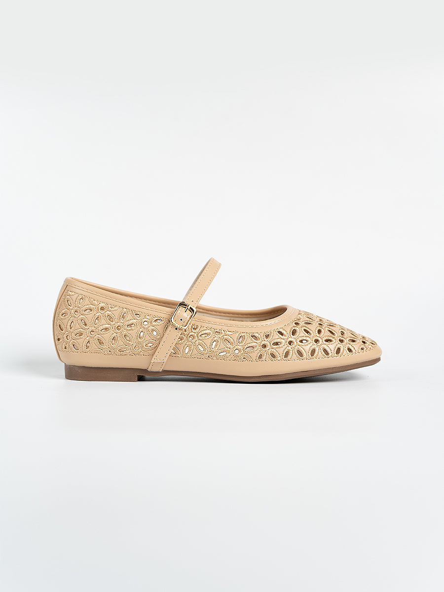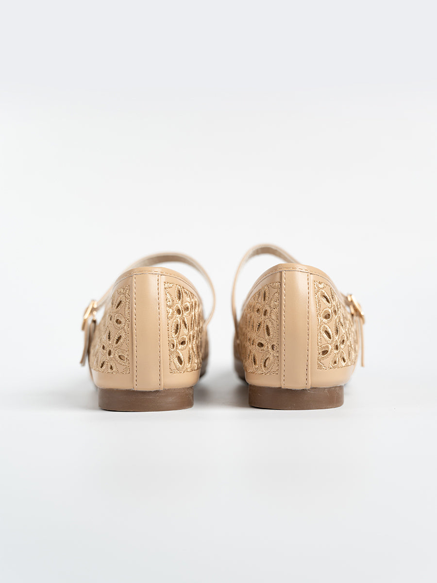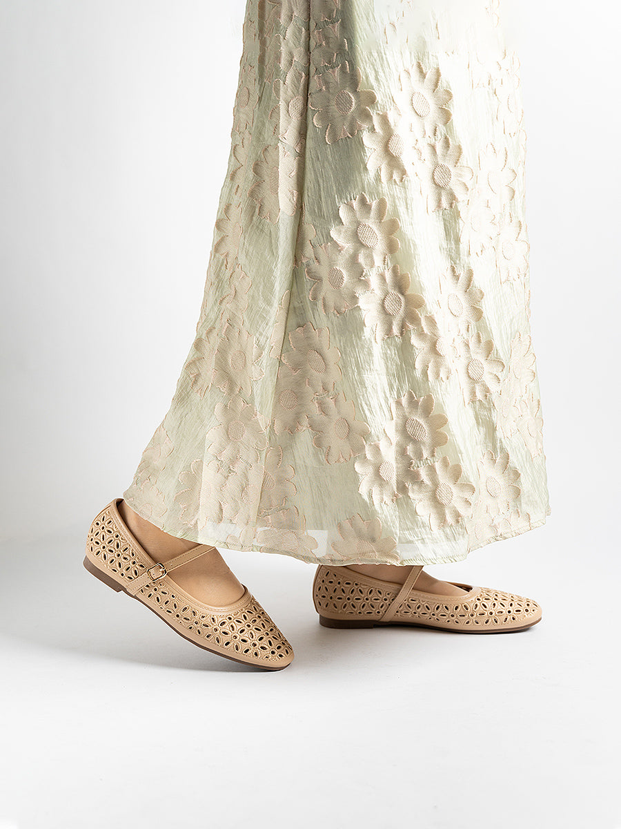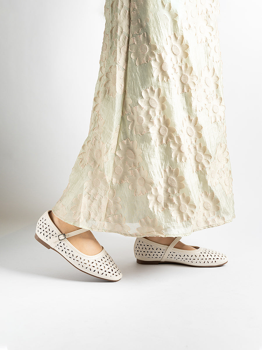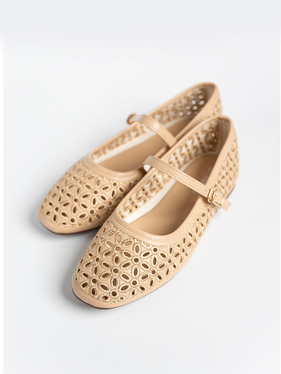 Soft, breathable, and featherlight, Elora Eyelet Strap Flats is made to follow you through the quietest and most meaningful moments. Effortlessly matching any outfit, these flats feature elegant flower-eyelet accents with functional strap in the center, and a rounded toe silhouette for added flair.