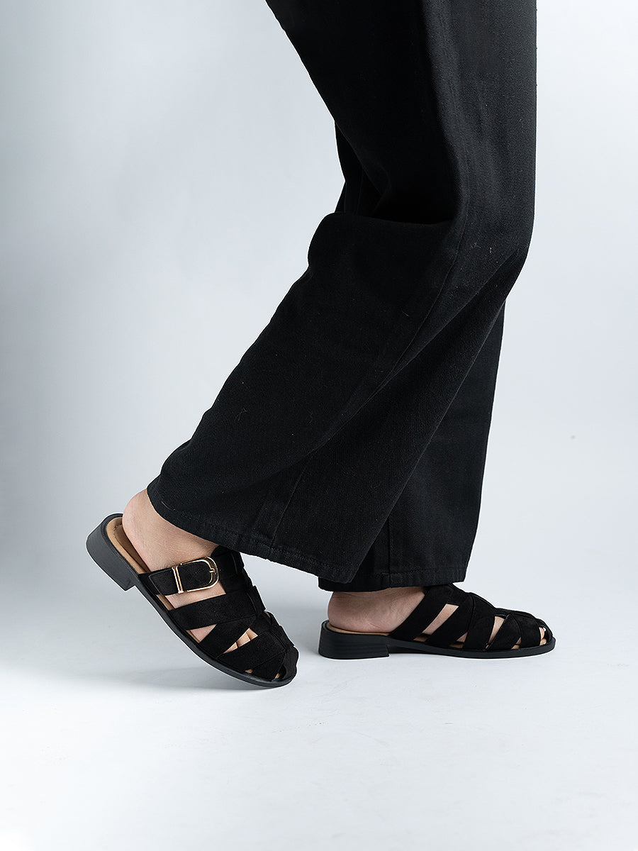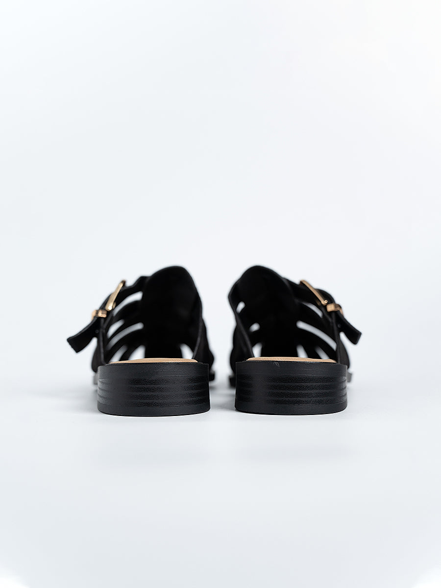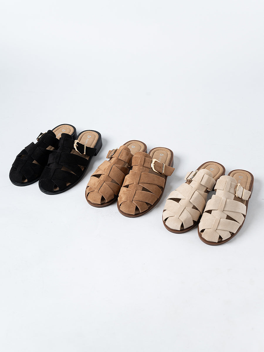 The Flynn Suede Cage Mules are inspired by classic gladiator styles, crafted from soft suede leather and accented with a polished shiny buckle for a refined touch. Set on 3cm low platform soles that offer the perfect lift, they blend timeless elegance with everyday comfort—effortlessly elevating your look from day to night.