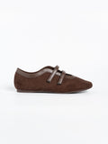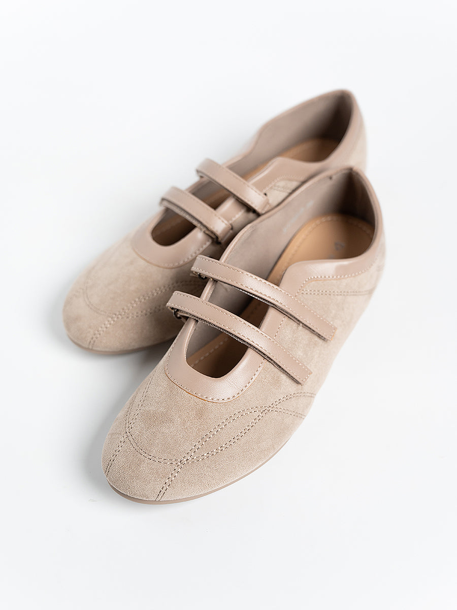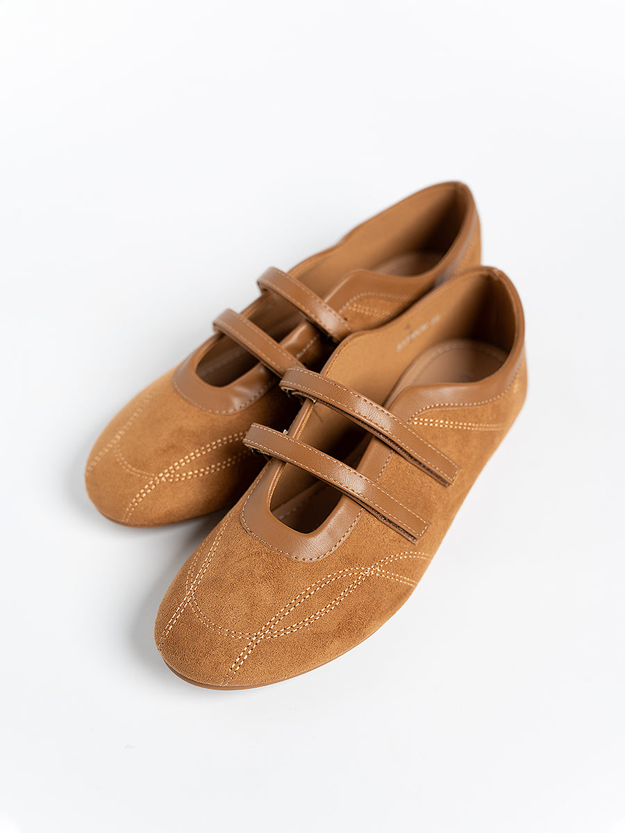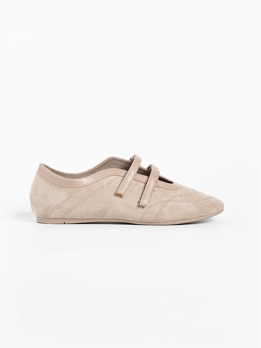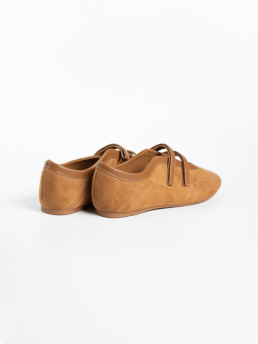 Voline Suede Flats: A suede reinterpretation of our signature Sport Ballerina, designed with a clean, minimal mood for everyday wear. Crafted from a refined blend of soft suede and smooth faux leather, this pair delivers a warm, polished aesthetic. Delicate stitching details highlight the classic round-toe silhouette, adding subtle character while maintaining effortless simplicity.